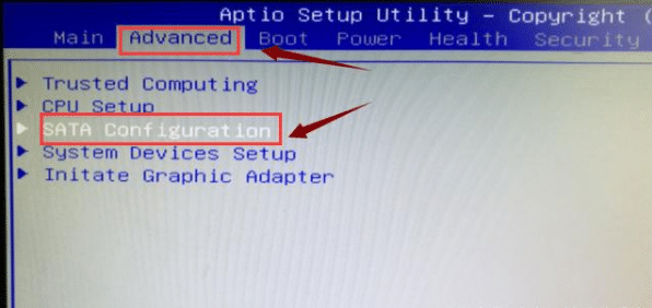 2、进入BIOS后,将界面切换到“advanced”窗口,找到“SATA Configuration”选项,并按回车键进入。